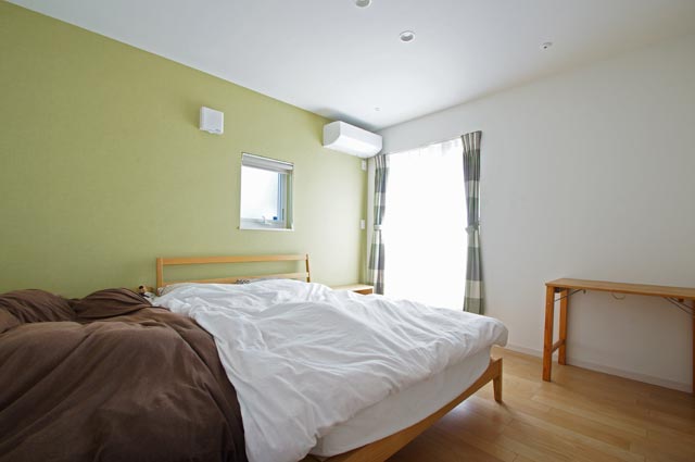 このお宅は、寝室の壁1面だけをオリーブ色して、空間にメリハリを付けました。
