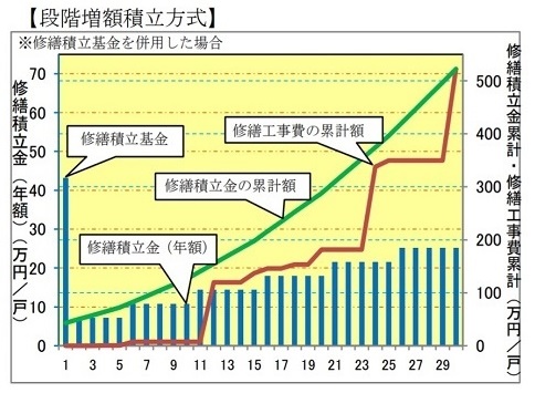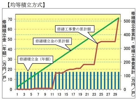 国土交通省のガイドラインでは、将来にわたって安定的な修繕積立金の積立を確保する観点からは、均等積立方式が望ましいとしています。