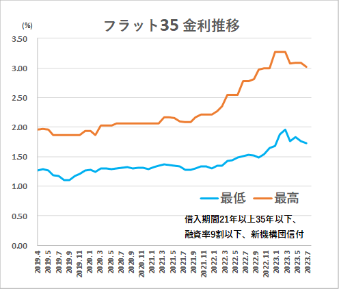 下のグラフはフラット35の金利推移なのですが、2022年1月頃から上昇基調にあることが見てとれます。