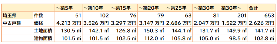 一方で埼玉県の中古戸建の表をみると、「~築5年」の平均価格が4,213万円ですから、4,620万円の予算であれば築5年以内の比較的築浅物件、あるいはもっと高い新築まで十分に検討できそうだとイメージできます。