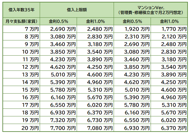 借入年数は35年を想定しています。家賃が○万円で支払い額を同じ○万円に収めたい場合、いくらまで住宅ローンを組むことができるか?という表になります。