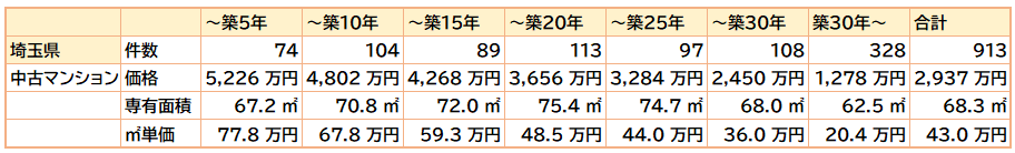 埼玉県の中古マンションの表を見ると、「~築5年」の平均価格が4,213万円で「~築10年」の平均価格が3,526万円なので、大体築5~10年くらいのマンションが検討できるというイメージができそうです。