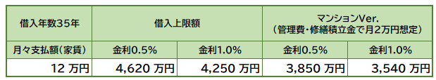 例えば、今の家賃(管理費等込みで)が12万円だとして、同じ月々の支払額でマンションの購入を検討するとします。管理費・修繕積立金で月2万円かかるとすると、ローンの支払いは10万円に抑えたいところです。その場合は左の借入上限額を参照するのではなく、右のマンションVer.で12万円を参照して3,850万円となります。