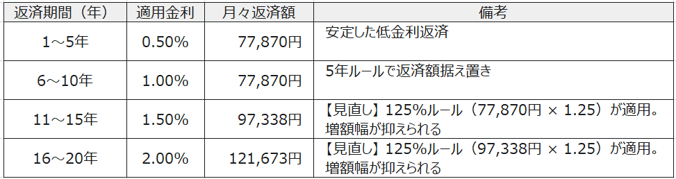 定義: 金利が上昇しても、毎月の返済額は5年間変わらないというルールです。