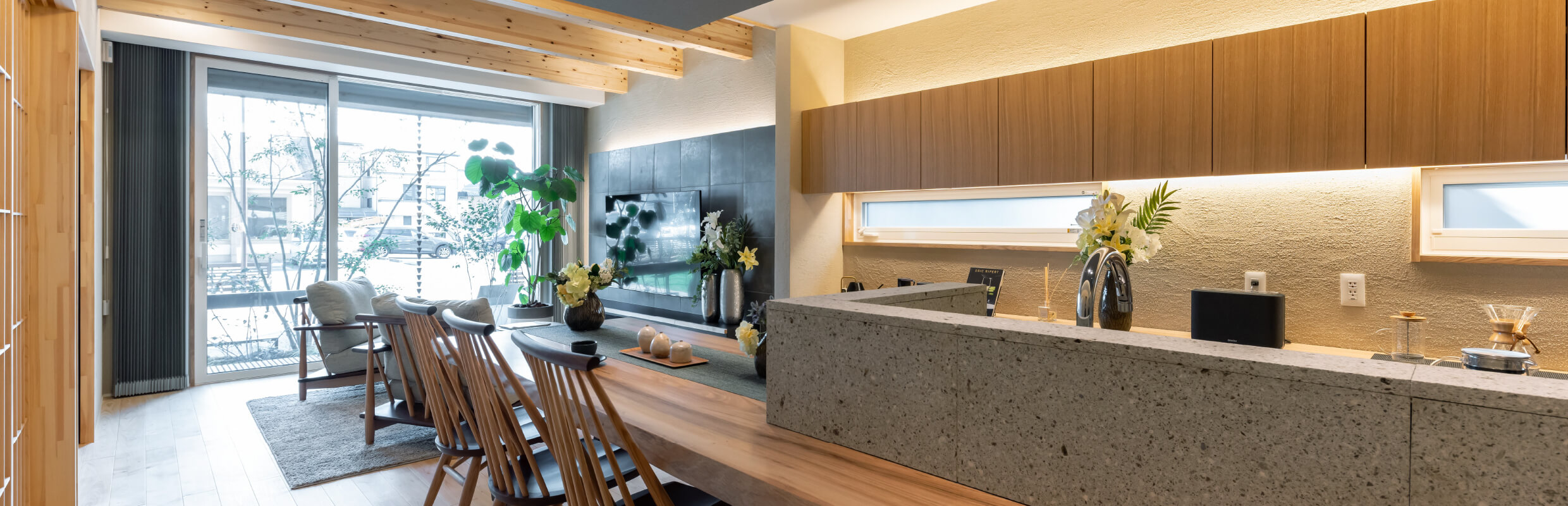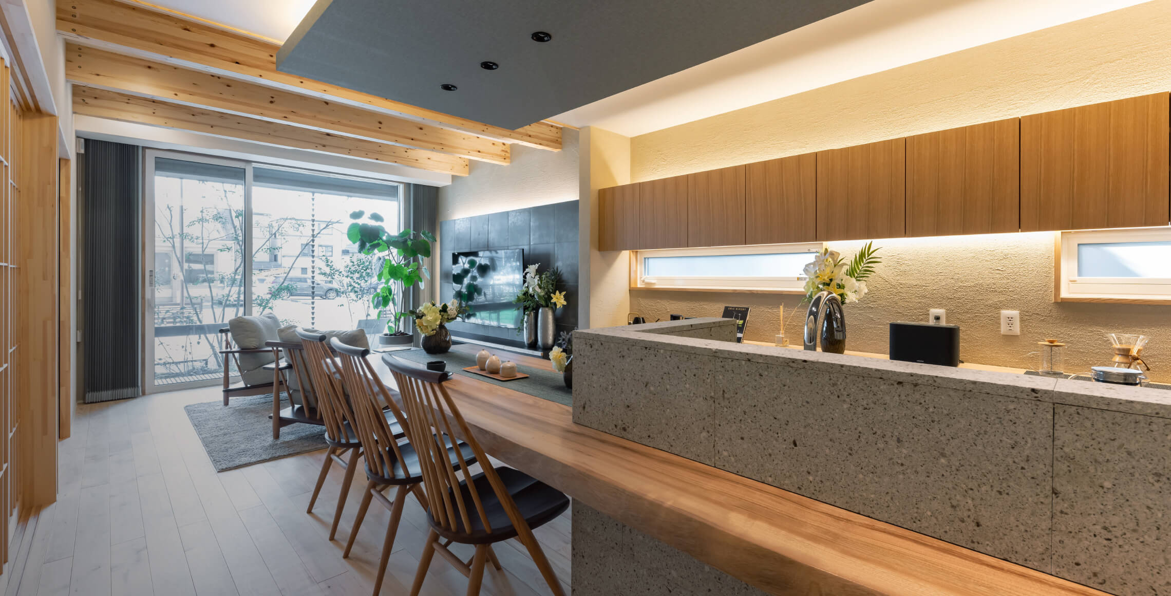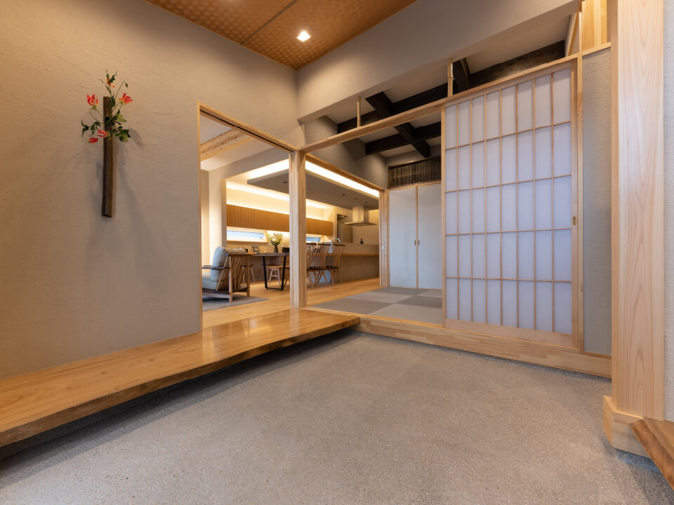 LDKは自然に囲まれた空間で、時には友人を招いてホームパーティーの場として、時には家族団らんの寛ぎ空間として、昔ながらの「兼ねる」空間構成に。また、旅館のエントランスを感じさせる土間空間や、個人の空間は確保されながらも人の気配を感じるスタディスペースを設け、非日常が日常になる空間を実現しています。