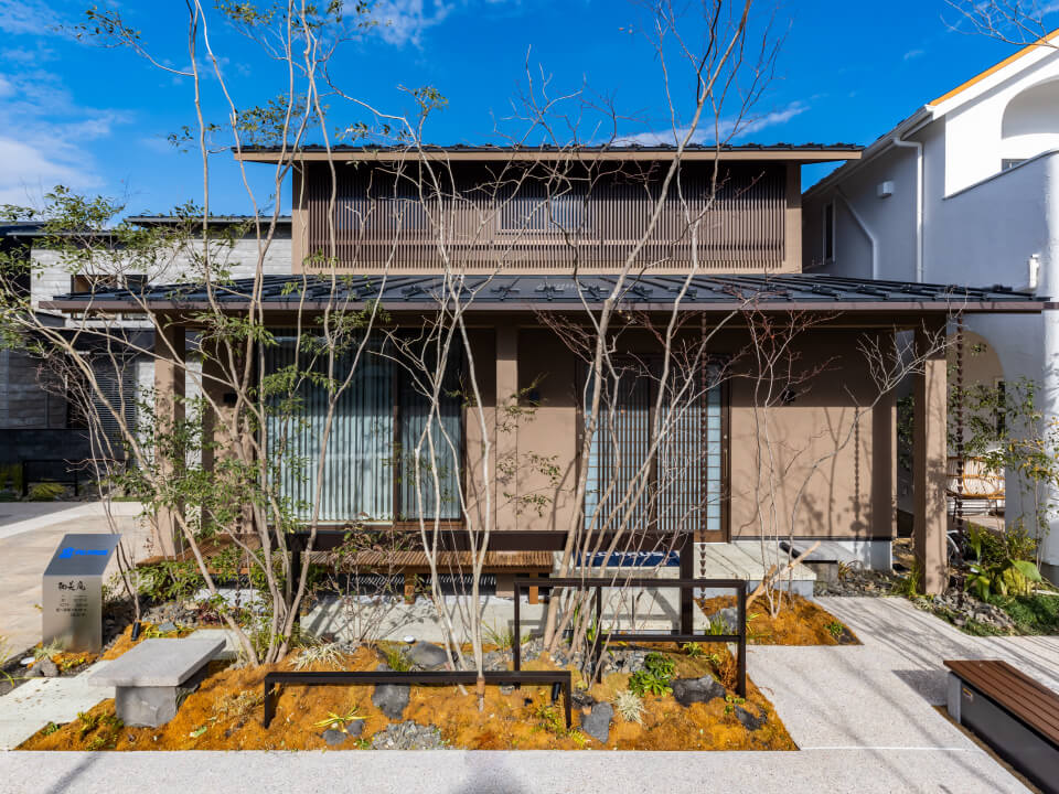 塗壁や木格子など、日本建築ならではの自然素材と、太陽光が生み出す自然のエネルギーの調和を図り、光熱費を抑えたZEH仕様の建物です。新しい生活様式を取り入れながらも、日本人の心をくすぐる、どこかなつかしい印象を残した居心地の良い空間を演出しています。