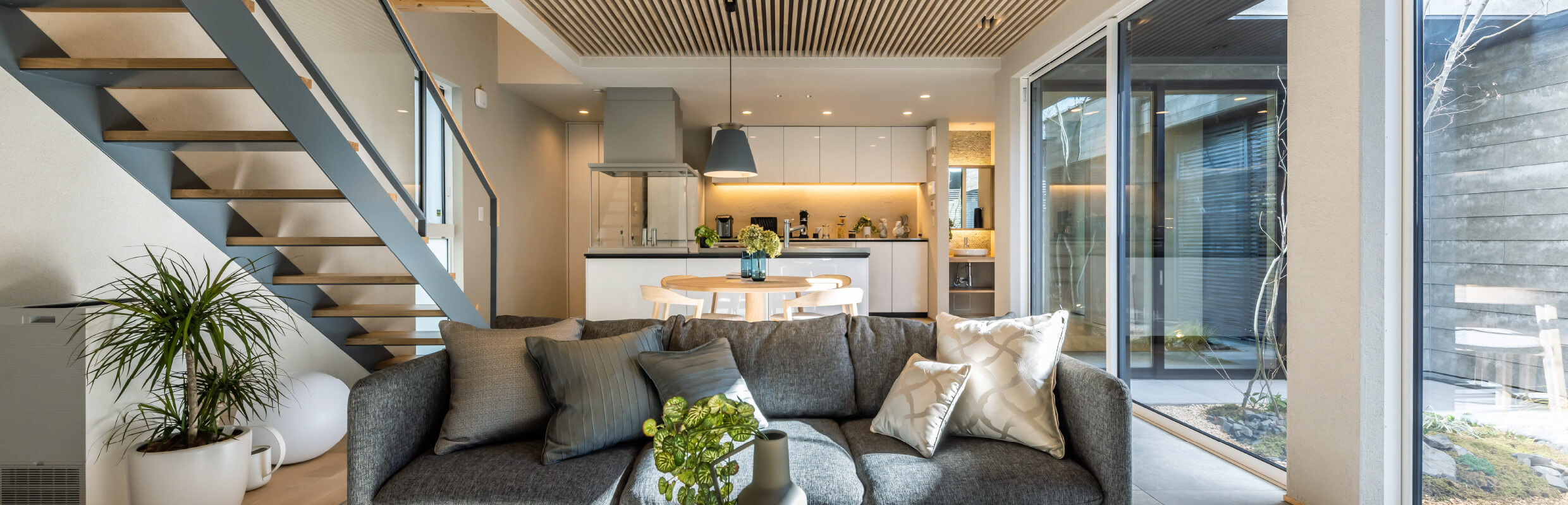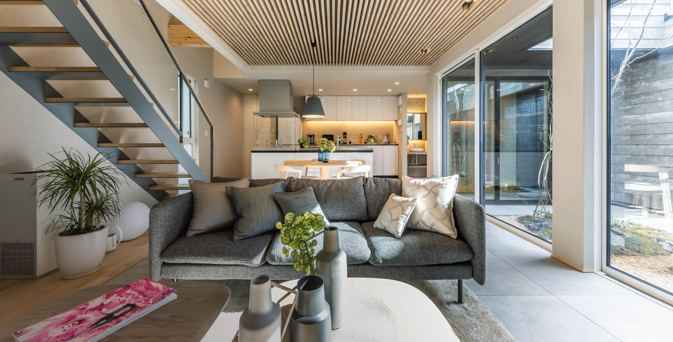 中庭に面して配置された部屋からは季節のうつろいや、家族の繋がりが感じられます。LDKは外につながる「開放的で広々とした空間」を、個々の部屋では“ヌック”と呼ばれるこじんまりとした「落ち着いた隠れ家のような空間」を楽しむことができます。家で過ごす時間が多い今、常に家族の繋がりを感じながら、個々の生活と、プライバシーのバランスを取った空間構成を実現しています。