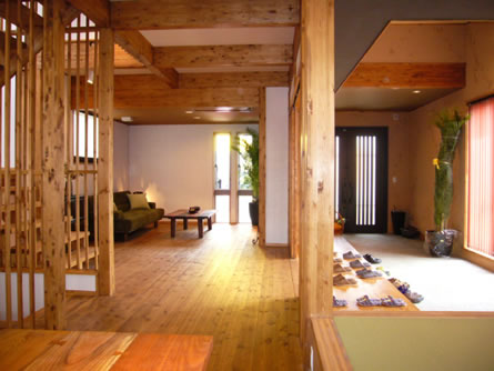 | 土間: | 玄関を入ると、天井高3m60cmの開放空間が広がります。趣味の作品を展示するミニギャラリーとしても利用できる土間空間です。銘木材を大胆に使用した敷台では、家族やお客様とのコミュニケーションがはずみます。 |