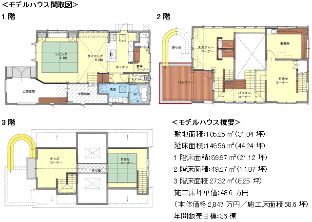 その最初のモデルハウスとなる当展示場では、「子どもの知性と感性をみがく家」をコンセプトに設定。キッチンで家事をするお母さんが、子供が1階でテレビを見ているとき、2階で勉強するとき、そして3階で遊ぶときでさえも、その様子がわかるような開放的で回遊性のある空間を実現。いつでも親子がふれあえる家を、腕のいい棟梁の粋と工夫によって実現しました。