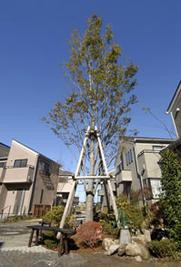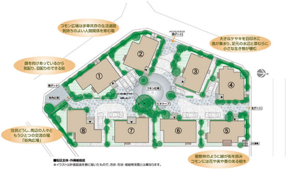 緑豊かな環境は、「コモン」だけではなく街区全体の外周にも及んでいます。各戸は道路(公道)の境界線より1m以上セットバックして建てられており、グリーンベルトが街区全体を覆うようになっています。これによって街区は、屋敷林に囲まれた一つのお屋敷のような景観となっており、外構部の緑化率も50%を超えています。また、外周道路の南の一角には、樹木を配した「街角広場」が設けられています。近隣住民との交流を促進させるスペースとなっている他、共用のゲストパーキングや宅配便、介護サービスカーの駐車スペースとしても機能します。