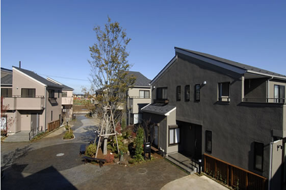 通常の住宅開発であれば、各戸のアプローチ・駐車場が外周道路に顔を向け、家同士はただ横顔や背中を向け合っているだけですが、「越谷ゆいまーる」では、全8棟の玄関アプローチと駐車場が中央の「コモン」に向かって配置されています。全ての人と車はメインゲートから「コモン」を通って各戸玄関に至ります。「コモン」は歩車共存のボンエルフ道路の形態でみんなの道路・広場として機能します。このような配置にすることで、住人同士が自然に触れ合えるとともに、不審者の侵入や火災等の異常に目が配れるヒューマンセキュリティが働く仕掛けを作っています。