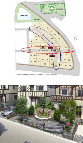 前作で高い評価をいただいた「ボゥ ヴィラージュ」シリーズの最新分譲となる【ボゥ ヴィラージュさいたま新都心】は、「さいたま新都心」駅より東方約3km、中川第一特定地区整理事業地内の緩やかな丘陵地帯に位置します。本物件では、この地形を活かし今回は、北フランスの美しい集落に見られるおおらかな丘陵風景を再現しました。幅員6mのゆとりある道路を東西、南北に配置。開放感のあるゆったりとした風景を演出するとともに、2つの道路に違った個性を持たせ、通りごとに表情の違う美しさが感じられる街並みを作り上げました。