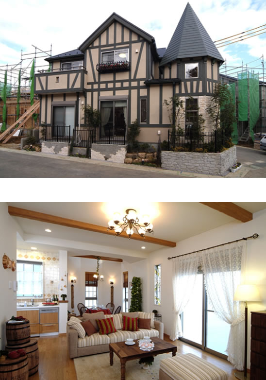 二つの通りが交差する角に建つモデルハウス(1号棟)は、尖塔(とんがり屋根)を持つ小さな教会をイメージしており、この分譲地のシンボル的な住戸となっています。