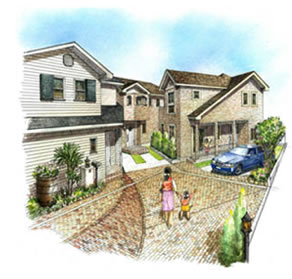 北フランスの集落に見られるような、小さな商店が建ち並ぶ賑わい感のある通りを演出し、また通りの中ほどには住民同士のふれあいを醸成する「ロシュパルク」(石造りの小公園)を配置しております。