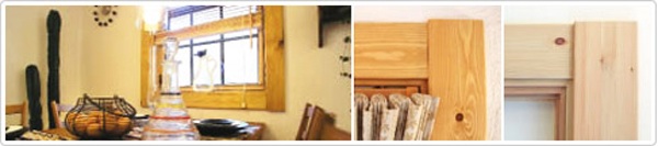 窓、天井、廻り縁、巾木すべてに、節あり赤松ケーシング材を活用。ビニールクロス、塗壁、タイルなど異なる内装仕上げ材と調和するかを検証するために、さまざまな組み合わせにしています。