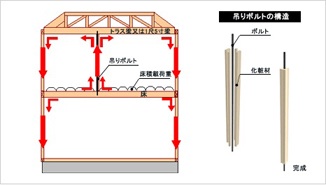 吹き抜けがあっても、屋根の水平構面を強化できる金物や、段差の違うスキップフロアでも強度が一定な金物、耐力壁の性能を最大限に引き出す接合システムなどを採用しています。
