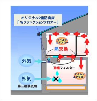 建物上方の暖かい空気を熱回収機で循環させるシステム。吹き抜け空間の温度感の向上を実現するシステムです。