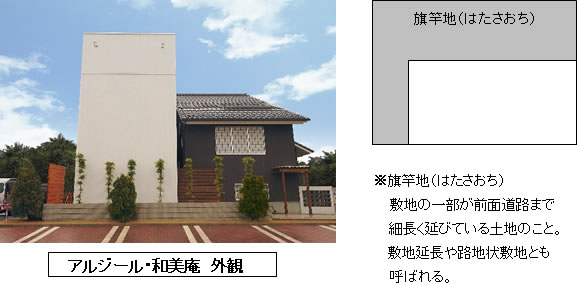 今回も展示場の1区画(約67坪)に『アルジール』と『和美庵』の2棟を配置し、1棟30坪台という“リアルサイズ”住宅を提案するとともに、『アルジール』については、都市部などの住宅密集地に多くみられる、旗竿地※といった敷地条件を採用しました。加えてモデルハウスの“旗”の部分は奥行きわずか5.5mという細長い短冊状の敷地とし、周囲を建物で囲まれている環境を想定。設計の工夫により住み手のプライバシーに配慮しながら、採光と通風の 確保を実現させたモデルハウスとなっています。