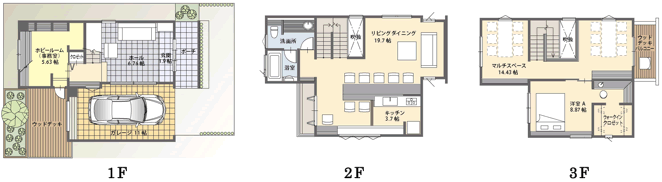 | 延床面積: | 45.70坪(151.42m2) 1F:16.09坪(53.30m2) 2F:15.46坪(51.23m2) 3F:14.15坪(46.89m2) |