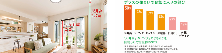 コミュニティが醸成され、愛着が湧き、大切にしたいと思える。そんな価値のある街・住まいをお届けします。「天井高」「リビング」のどちらかを回答した方は全体の92%。ポラスの住まいでお気に入りの部分「天井高2m70cm」を標準装備。日本の多くの住宅は、天井高2m40cmが一般的。そんな常識に対して、ポラスグループでは1996年から「天井高2m70cm」を標準化。明るくて広々とした空間にこだわり続けてきました。