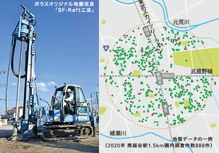 創業以降、徹底して地域密着にこだわってきたポラスグループは、施工エリアの地盤データを熟知。これまでに10万件以上の詳細なデータを蓄積してきました。地盤強化が必要だと判断した場合は、独自開発した地盤改良工法「SF-Raft工法」などさまざまな工法をご提案します。家を支える地盤を整え、構造的に強い家を組み立てる。この2つの軸のおかげで、本当の意味での「地震に強い、安全な家」がつくれるようになったのです。